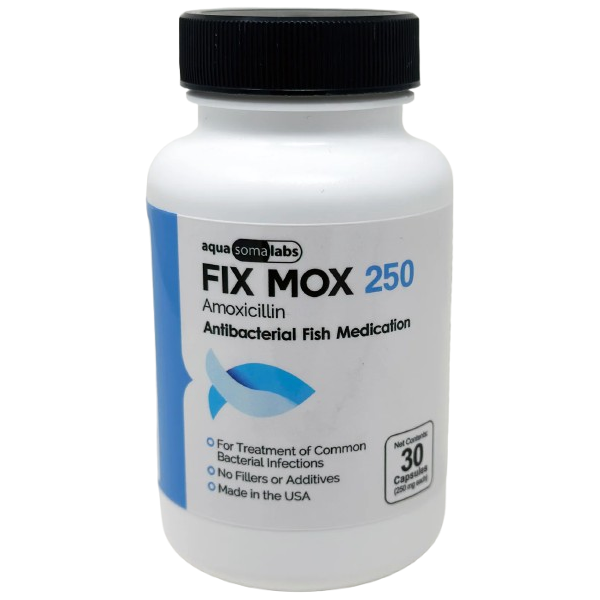 Dosage & Administration: Add the contents of one Fix mox capsule (250 mg) into aquarium for each 10 gallons of water to be treated. Repeat in 24 hours. It is suggested that a partial water change be made between treatments. It is recommended that extended medication baths continue for a minimum of 5 days and not more than 10 days. Discontinue treatment with this medication if no improvement is noted within 5 days. To remove harmless yellow color, change 20% of water and use charcoal filter until clear.